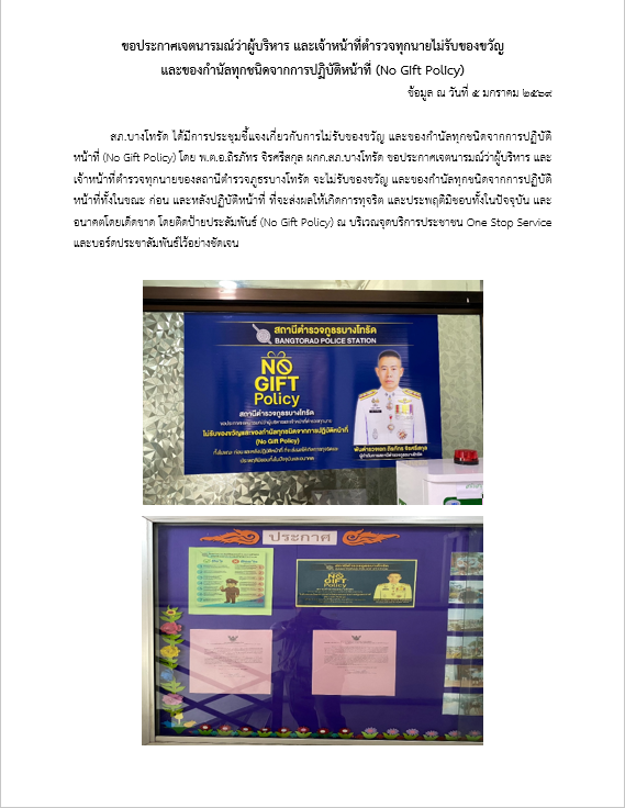 ประชาสัมพันธ์ป้ายประกาศไม่รับของขวัญ และของกำนัลทุกชนิด (No Gift Policy) 5 มกราคม 2569 โดย adm_bangthorat / ข่าวประชาสัมพันธ์ ประชาสัมพันธ์ป้ายประกาศไม่รับของขวัญ และของกำนัลทุกชนิดจากการปฏิบัติหน้าที่ (No Gift Policy)