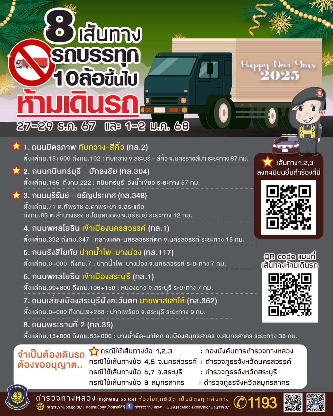 แจ้งประชาสัมพันธ์ ประชาชน หน่วยงาน หรือบริษัท ที่มีความจำเป็นต้องเดินรถในช่วงวันหยุดเทศกาลปีใหม่ พ.ศ.๒๕๖๘ ให้ดำเนินลงทะเบียนตาม QR Code หรือเว็บไซต์ ในเส้นทางที่ท่านจะต้องเดินรถในวันเวลาดังกล่าว เพื่อความถูกต้องในการเดินรถในช่วงวันหยุดดังกล่าว