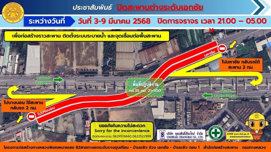 ขอประชาสัมพันธ์ การปิดสะพานต่างระดับเอกชัย ตั้งแต่วันที่ 3 – 9 มีนาคม 2568 ระหว่างช่วงเวลา 21.
